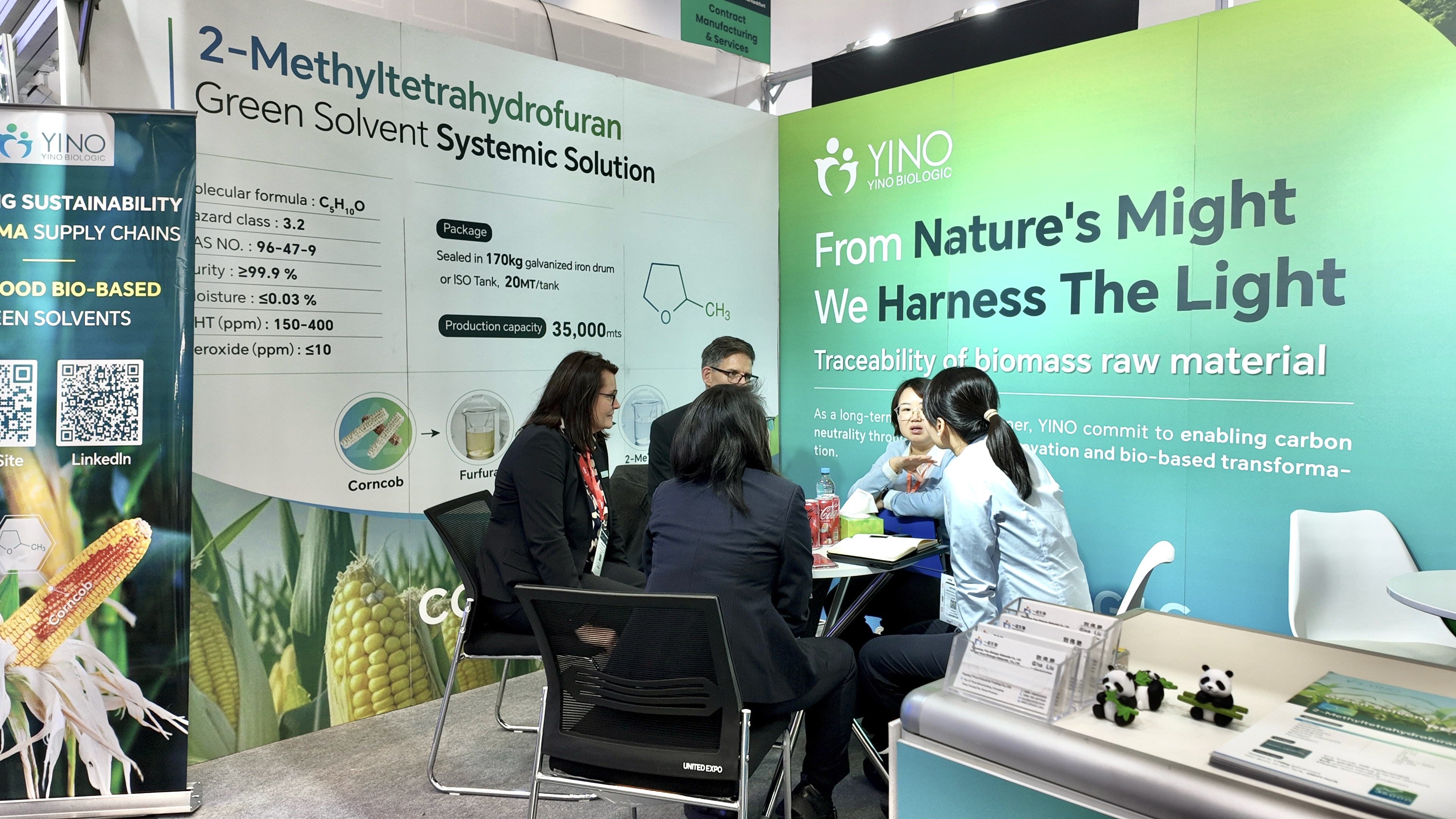 在制藥生產(chǎn)中,溶劑與原料的選擇不僅關(guān)系到工藝的安全性與環(huán)境友好性,更直接影響藥物純度和生產(chǎn)效率。YINO Biologic 以非糧生物質(zhì)玉米芯為原料,從源頭實(shí)現(xiàn)碳減排與資源高效利用,構(gòu)建了覆蓋從原料到終端制造的綠色供應(yīng)鏈。本次展會(huì)上,公司重點(diǎn)展示了多款高性能可持續(xù)產(chǎn)品,包括可作為活性藥物成分(API)合成綠色溶劑的 2-Methyltetrahydrofuran(2-MeTHF),該產(chǎn)品可有效替代傳統(tǒng) THF,顯著降低揮發(fā)性有機(jī)物排放并提升反應(yīng)安全性與效率;用于高端藥物保護(hù)基及精細(xì)化工中間體合成的關(guān)鍵原料 3,4-Dihydro-2H-Pyran(DHP);以及新一代高純度環(huán)狀酯原料 δ-Valerolactone(δ-VL),廣泛應(yīng)用于藥物輔料及聚合物開發(fā)領(lǐng)域,充分展現(xiàn)了 YINO 在綠色化學(xué)與可持續(xù)材料創(chuàng)新方面的實(shí)力。